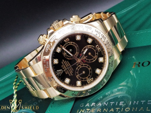 18K黃金錶殼、錶帶、摺疊扣、旋入式錶冠、視距儀刻度錶框 / 最新款黑色八鑽面盤 / 夜光指針 / 藍寶石水晶玻璃 / 防偽內圈 |