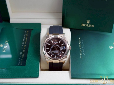 ROLEX 勞力士 Sky-Dweller 326235 永恆玫瑰金材質 蠔式 天行者 沙羅裝置 年曆錶 兩地時區 2023年新式綠卡 巧克力面盤 橡膠錶帶款 自動上鍊 42mm