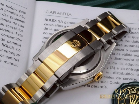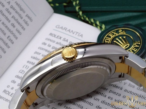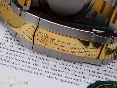 蠔式鋼與18ct黃金、錶帶、摺疊帶扣 / 旋入式錶冠 / 黃金棕梠葉面盤 鑲鑽時標 / 藍寶石水晶玻璃 / 防偽內圈 |