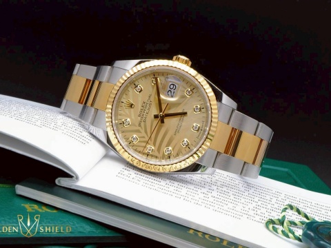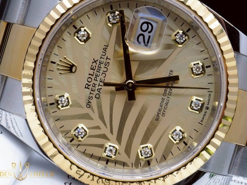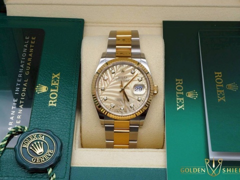 | ROLEX 勞力士 蠔式 Datejust 126233 2023年保單 鑲鑽時標 黃金棕梠葉面盤 18K黃金 半金款 DJ36 經典三角坑紋錶圈 新式綠卡 3235機芯 36mm |