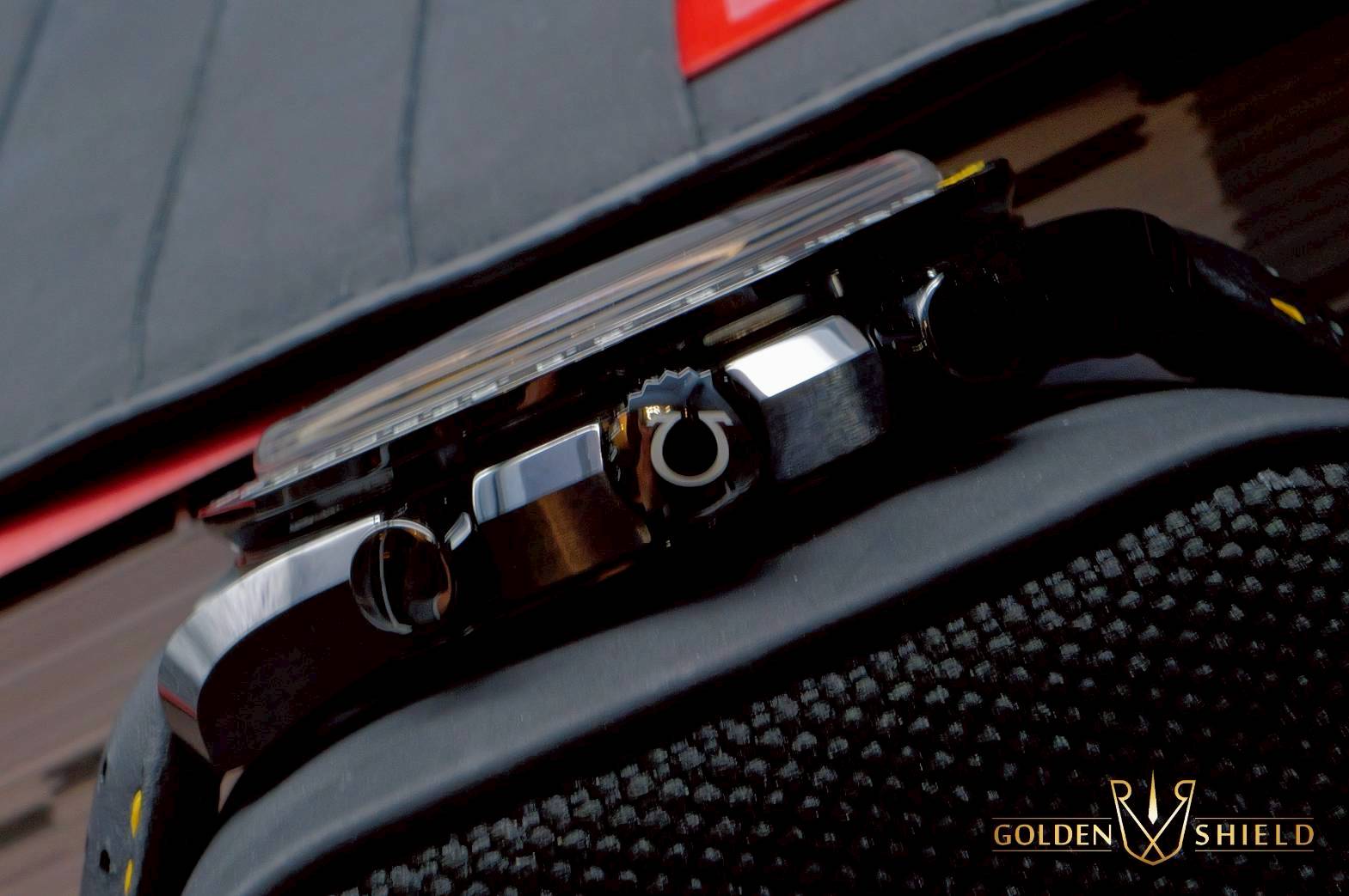 黑色陶瓷錶殼、帶扣、錶冠及計時按把 / 黑色鏤空面盤、黑色計速儀刻度錶圈 / 夜光指針及時標 / 藍寶石水晶玻璃鏡面及透明錶背 |