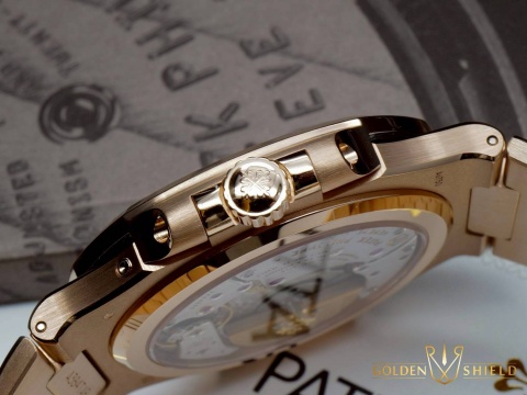 玫瑰金款式 / 旋入式表冠 / 藍寶石水晶透蓋 / 圓潤八角形表圈/棕色日輝紋錶盤 / 覆熒光塗層金質立體時標 / 玫瑰金錶鍊 / Nautilus折疊式表扣 |