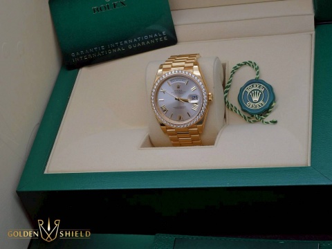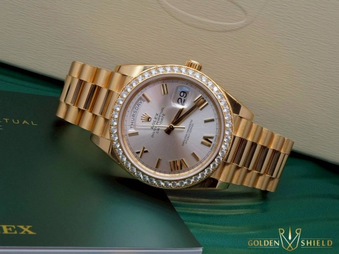 | ROLEX 勞力士 DayDate 228348RBR 18K黃金材質 228348 鑲鑽外圈 羅馬字時標 2021年保單 新式保卡 自動上鍊 40mm |