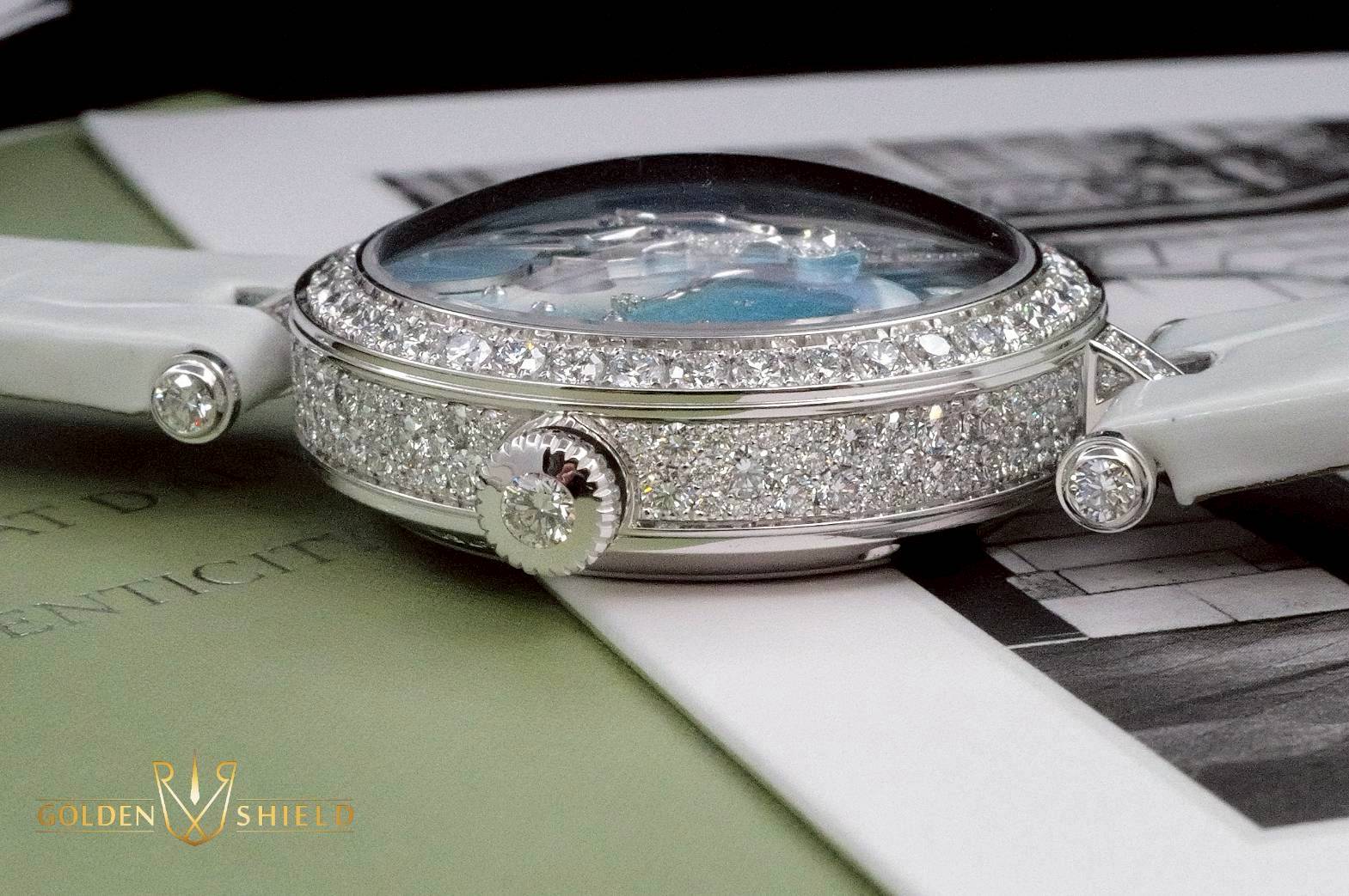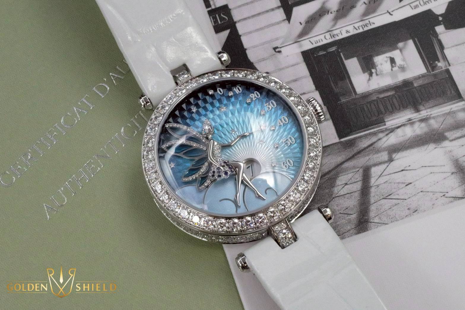 璣鏤雕花珍珠母貝錶盤,圓形鑽石;雕刻白K金仙子,圓形藍寶石,圓形及玫瑰形切割鑽石,細工彩繪;白K金翅膀,Grisaille背光剪影琺琅搭配彩繪玻璃琺琅,圓形鑽石;白色珍珠母貝雲朵,白K金 |