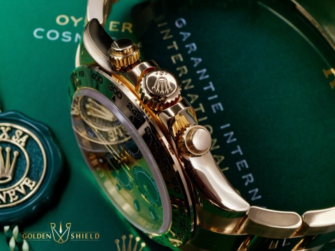18K黃金材質錶殼、計速儀刻度錶圈、旋入式錶冠、計時按鈕、錶鍊帶及摺疊帶扣 / 綠色面盤 / 夜光指針及時標 /
