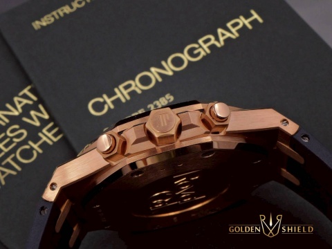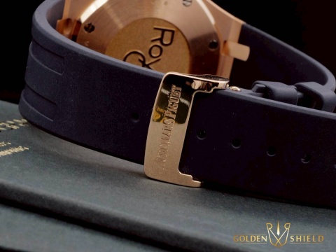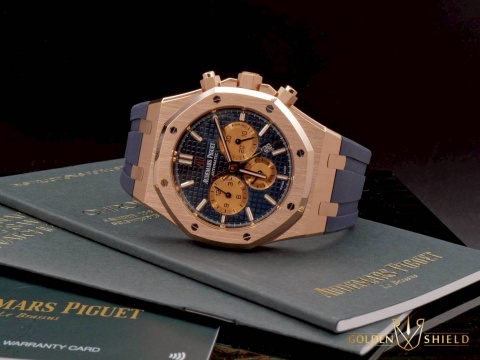皇家橡樹獨特八角形螺絲外露設計錶框 / 18K玫瑰金錶殼、摺疊扣、旋入式錶冠、計時按把 / 大型格?深藍色配玫瑰金計時圈雙色面盤、夜光指針、柱狀時標 / 原廠藍色鱷魚皮錶帶 / 藍寶石水晶玻璃 |