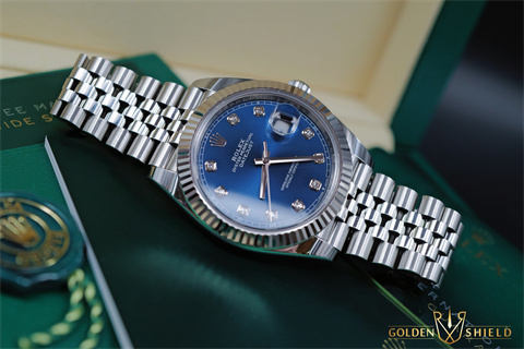 18K白金三角坑紋錶圈 / 904L不鏽鋼材質錶殼、錶帶、摺疊扣、旋入式錶冠 / 原鑲鑽石時標 / 藍色放射面盤、夜光指針 / 藍寶石水晶玻璃鏡面 / 防偽內圈 |