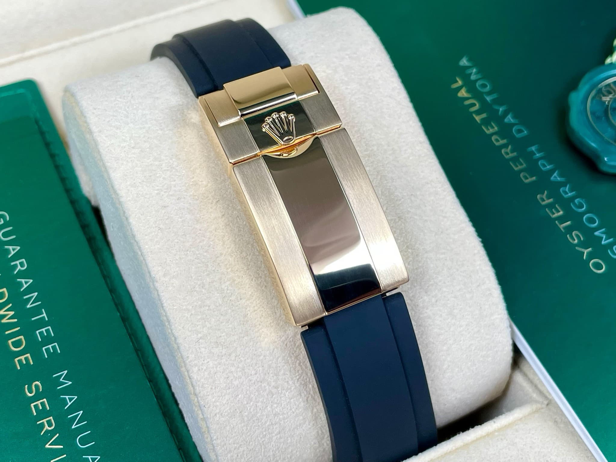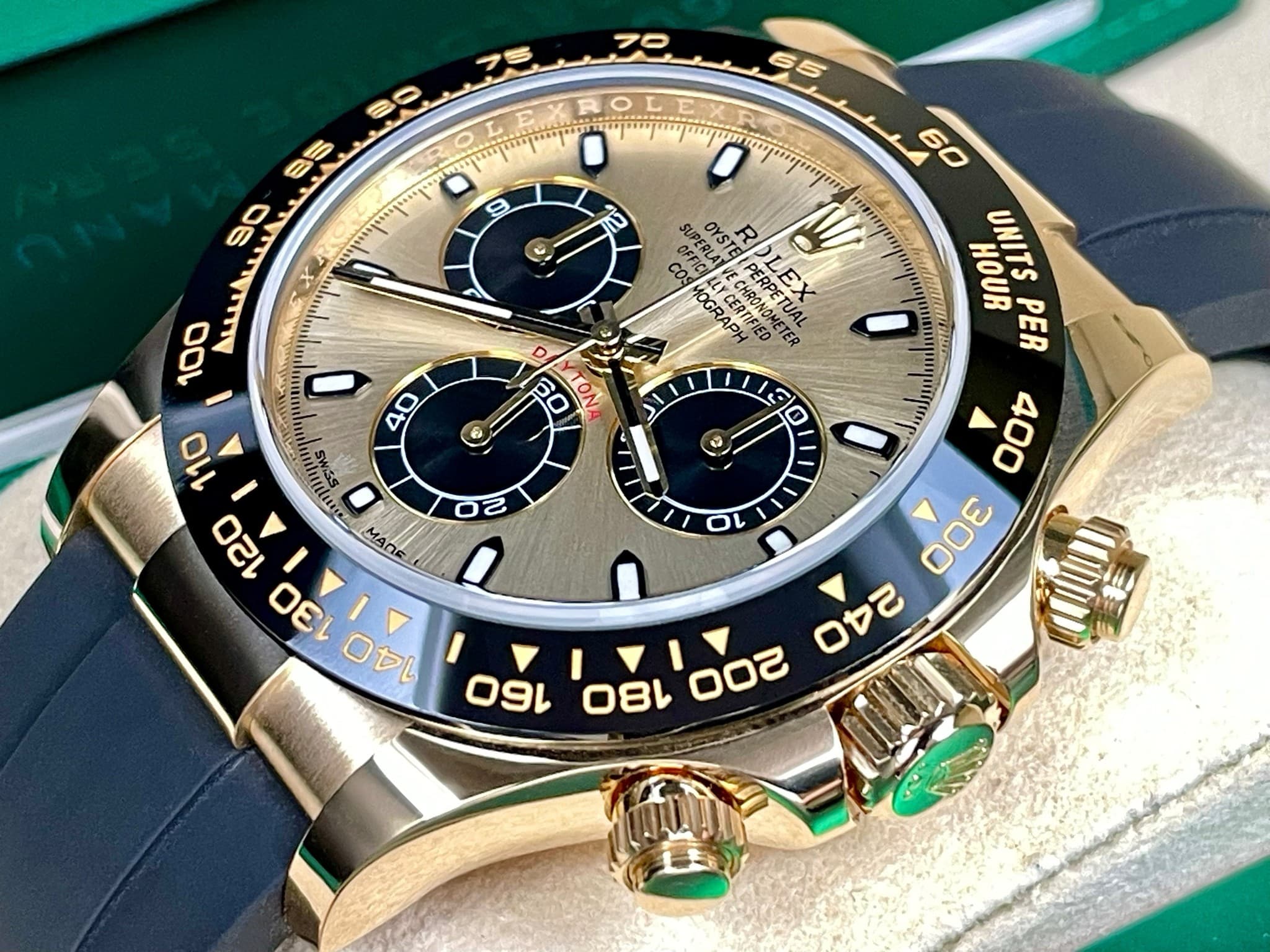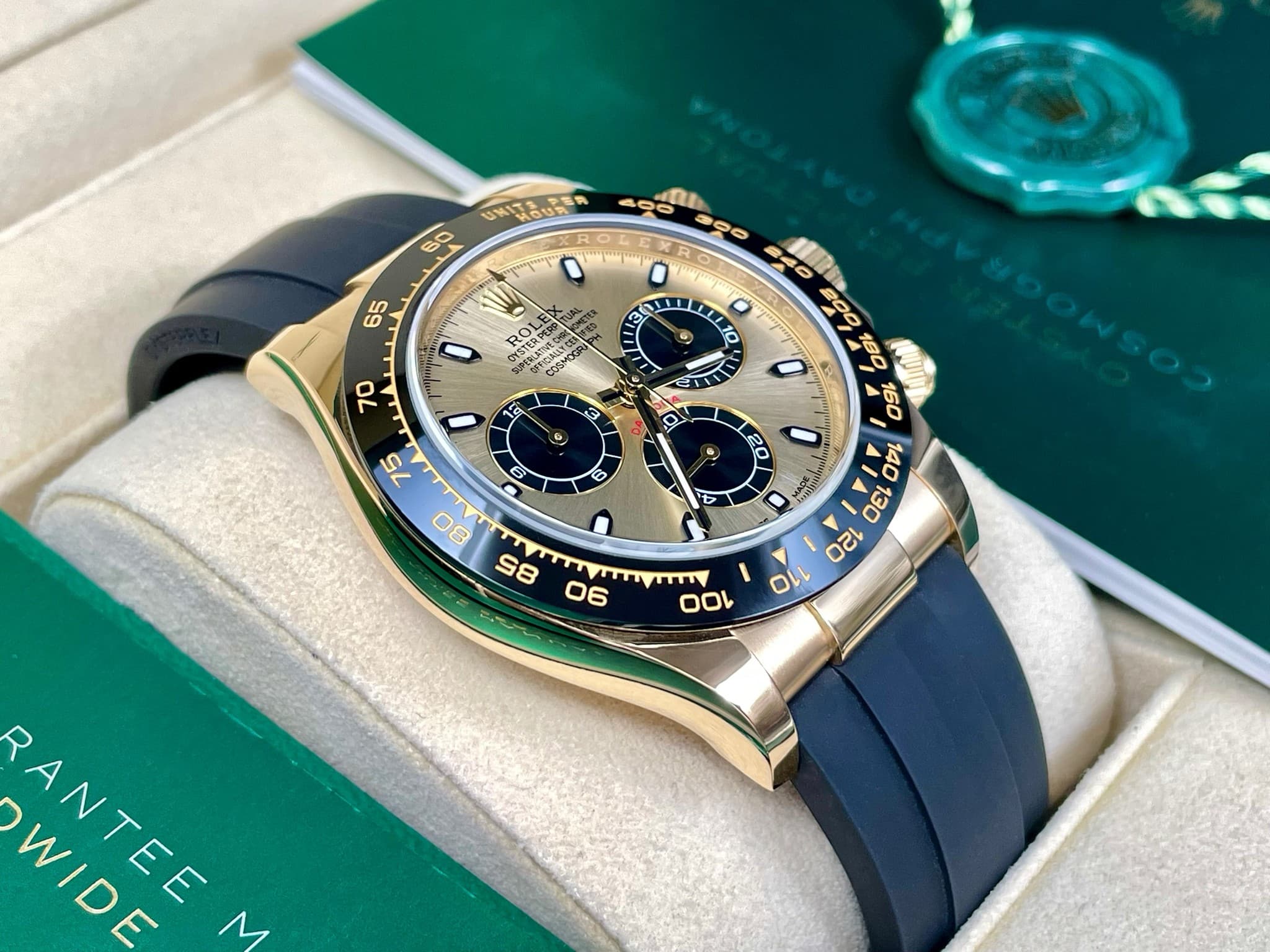 18K黃錶殼、摺疊扣、旋入式錶冠、黑色陶瓷視距儀刻度錶框 / 金色面盤、夜光指針、立體夜光時標 / 原廠黑色Oysterflex橡膠錶帶 / 藍寶石水晶玻璃 |