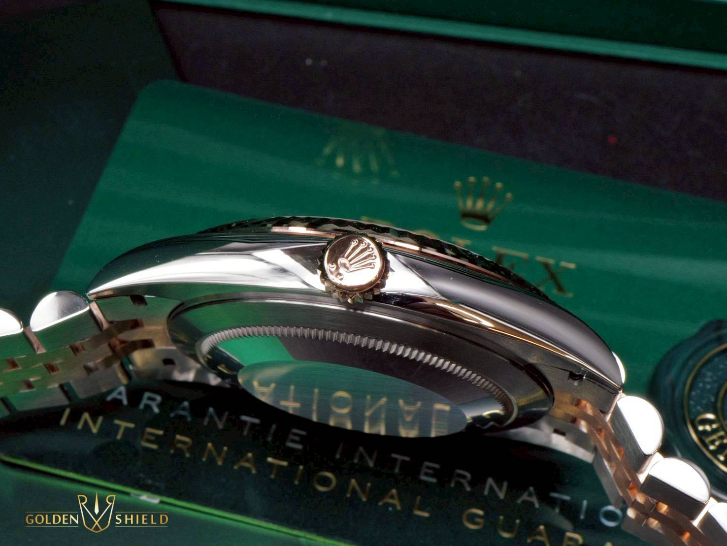 18K玫瑰金材質搭配904L不鏽鋼材質錶殼、錶帶及摺疊帶扣 / 日亮金色面盤 / 夜光時標 / 藍寶石水晶玻璃鏡面 |