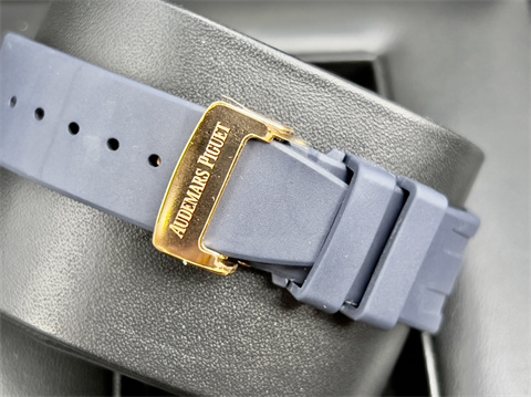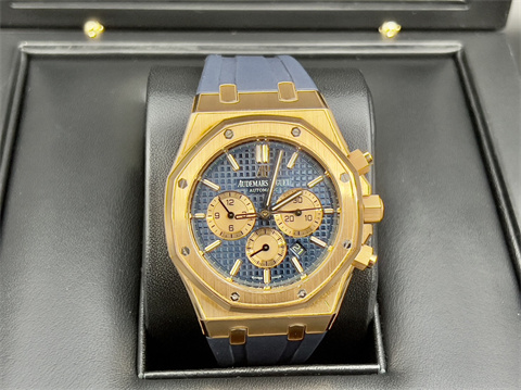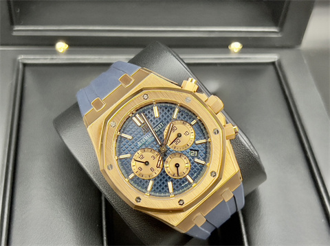 皇家橡樹獨特八角形螺絲外露設計錶框 / 18K玫瑰金錶殼、摺疊扣、旋入式錶冠、計時按把 / 大型格?深藍色配玫瑰金計時圈雙色面盤、夜光指針、柱狀時標 / 原廠藍色鱷魚皮錶帶 / 藍寶石水晶玻璃 |