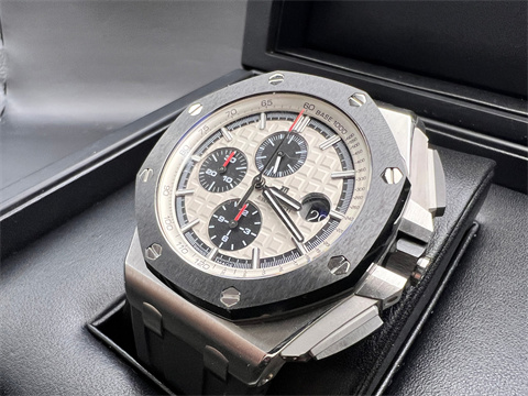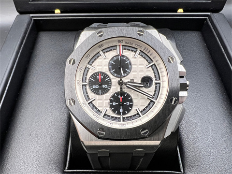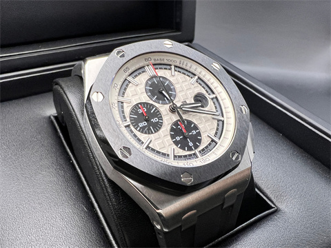 皇家橡樹獨特八角形螺絲外露設計陶瓷錶框 / 不鏽鋼錶殼、穿扣、陶瓷旋入式錶冠、計時按把 / 白色格紋搭配黑色計時圈面盤、夜光指針、立體時標 / 原廠黑色橡膠錶帶 / 藍寶石水晶玻璃、透明錶背 |